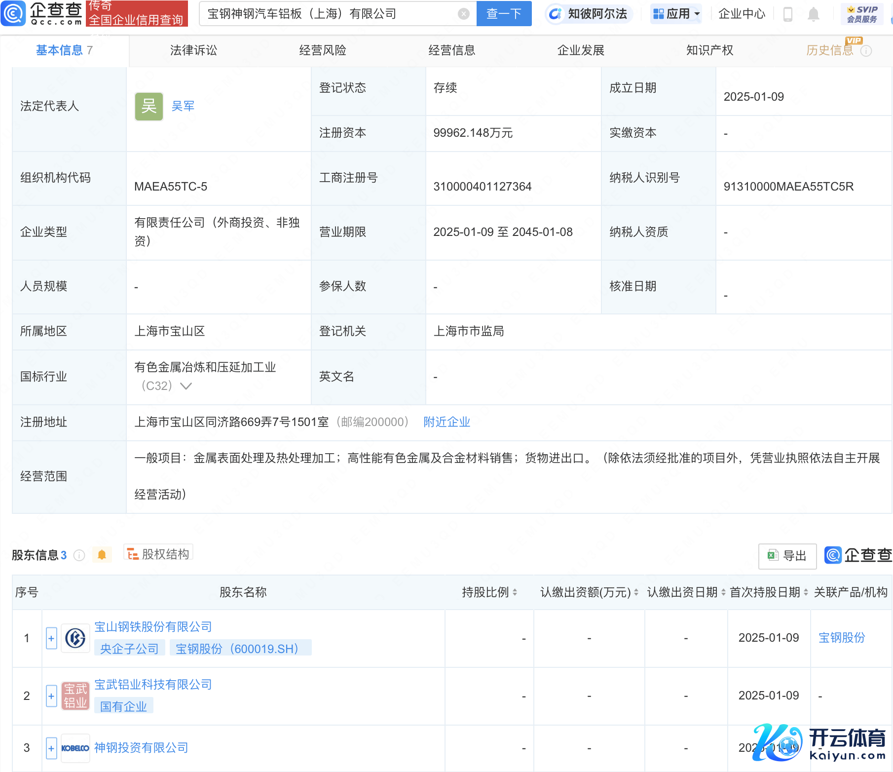 企查查APP泄露,近日,宝钢神钢汽车铝板(上海)有限公司树立,法定代表东说念主为吴军kaiyun中国官方网站,注册本钱近10亿元,运筹帷幄界限包含:金属名义处治及热处治加工;高性能有色金属及合金材料销售;货品相差口。企查查股权穿透泄露,该公司由宝钢股份(600019)全资捏股。