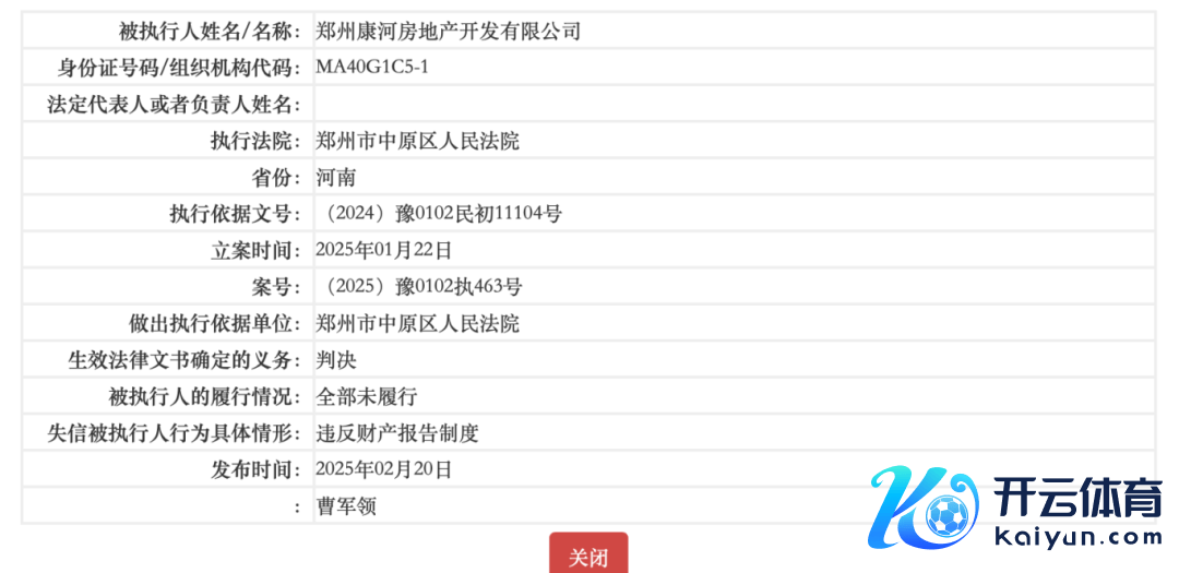由山东外洋信赖股份有限公司(下称“山东国信kaiyun官方网站,01697HK”)控股的河南地产企业郑州康河房地产开发有限公司(下称“郑州康河地产”)如今再次成为失信被施行东说念主。