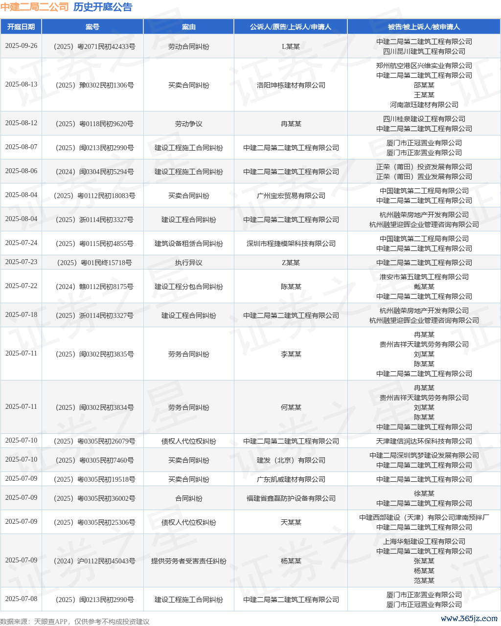 案号:(2025)粤0118民初9620号审理法院:广州市增城区东说念主民法院案由:办事争议当事东说念主信息: 原告/上诉东说念主:冉某某 被告/被上诉东说念主:四川桂泉诱骗工程有限公司、中建二局第二建筑工程有限公司开庭日历:2025年8月12日把柄统计,近一年内以中建二局第二建筑工程有限公司为当事东说念主的历史开庭公告有359则,其中案由为“交易左券纠纷”的公告以109则居首,其次为“建筑诱骗租出左券纠纷”有49则,“诱骗工程施工左券纠纷”有49则。历史开庭公告(前20条)如下: