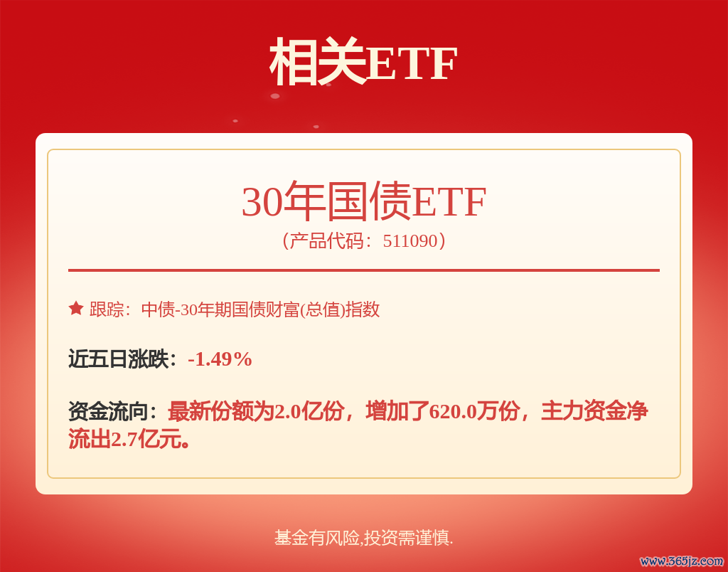 鹏扬30年国债ETF(511090)是当今商场上首只追踪中债30年期国债指数的ETF,具备T+0来往属性,既可使得投资者日内低买高卖博取收益,也可匡助投资者快速拉长组合久期或用作对冲权利仓位。该家具不错四肢客户的高弹性现款惩办器用和组合久期周折器用,短期在商场利率波动放大时,具备较强的来往属性,长期在低利率的配景下,具备较强的成就属性,值得投资者积极情切。