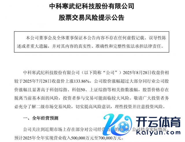 8 月 28 日,寒武纪发布股票交往风险领导公告称,公司祥和到近期商场上存在部分对公司筹画情况的预测,公司诱骗践诺情况,瞻望 2025 年全年杀青买卖收入 50 亿元至 70 亿元。