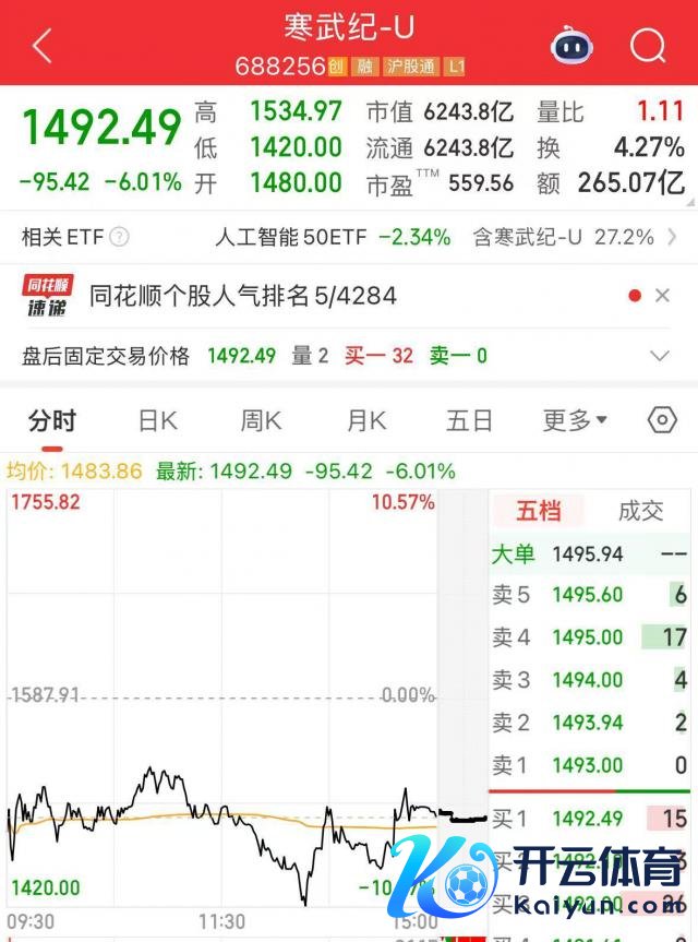 寒武纪午后跌幅一度扩大至 10%,扫尾收盘股价下落 6.01%。