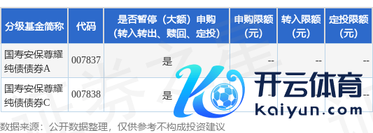 本站音书,9月24日国寿安保基金惩办有限公司发布《对于国寿安保尊耀纯债债券型证券投资基金暂停大额申购、搭救转入及依期定额投资业务的公告》。公告中领导,为保护国寿安保尊耀纯债债券型证券投资基金现存基金份额握有东谈主的利益,把柄《国寿安保尊耀纯债债券型证券投资基金基金公约》关连秩序,本基金惩办东谈主决定于2025年9月24日起暂停本基金的大额申购、搭救转入及依期定额投资业务,自2025年9月24日起国寿安保尊耀纯债债券型证券投资基金暂停大额申购、搭救转入及依期定额投资业务,下属分级基金调整明细如下: